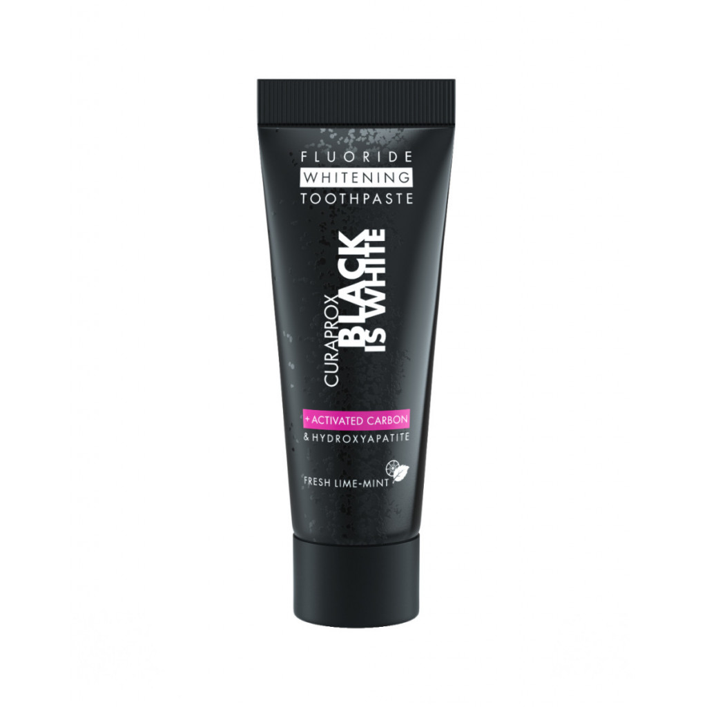 CURAPROX Black is White - відбілююча зубна паста. Освіжаюча, зі смаком лайму, відбілююча зубна паста Black is white знищує наліт та потемніння на зубах за допомогою активованого вугілля без пошкодження зубної емалі чи знебарвлення зубів. Має яскравий ментоловий смак.