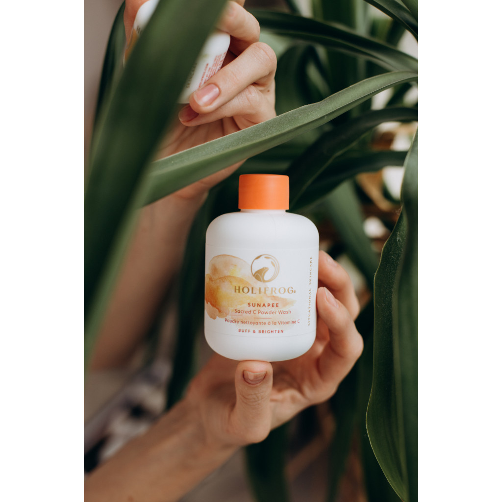 Ензимна пудра для вмивання HoliFrog Sunapee Sacred-C Brightening Powder Wash швидко перетворює шкіру, освіжає і очищає її. Пудра дбайливо відлущує ороговілі частинки, усуває чорні крапки та сальні пробки, бореться з тьмяністю та сірістю шкіри, вирівнює рельєф, робить шкіру гладкою та сяючою. Пудра стимулює клітини до оновлення, завдяки цьому значно покращується загальний стан епідермісу.