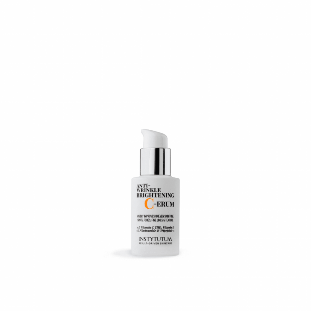 Instytutum Anti-Wrinkle Brightening C-Erum — ефективно висвітлює шкіру, зменшуючи вироблення меланіну, завдяки 15% вітаміну C THD у складі. Суперконцентрована сироватка додатково зволожує та живить тьмяну і суху шкіру.