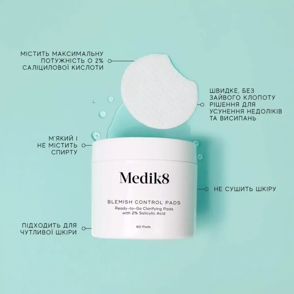 Medik8 Blemish Control Pads — безспиртові подушечки з 2% саліциловою кислотою для проблемної шкіри. Високоефективний засіб без спирту для усунення недоліків проблемної шкіри.