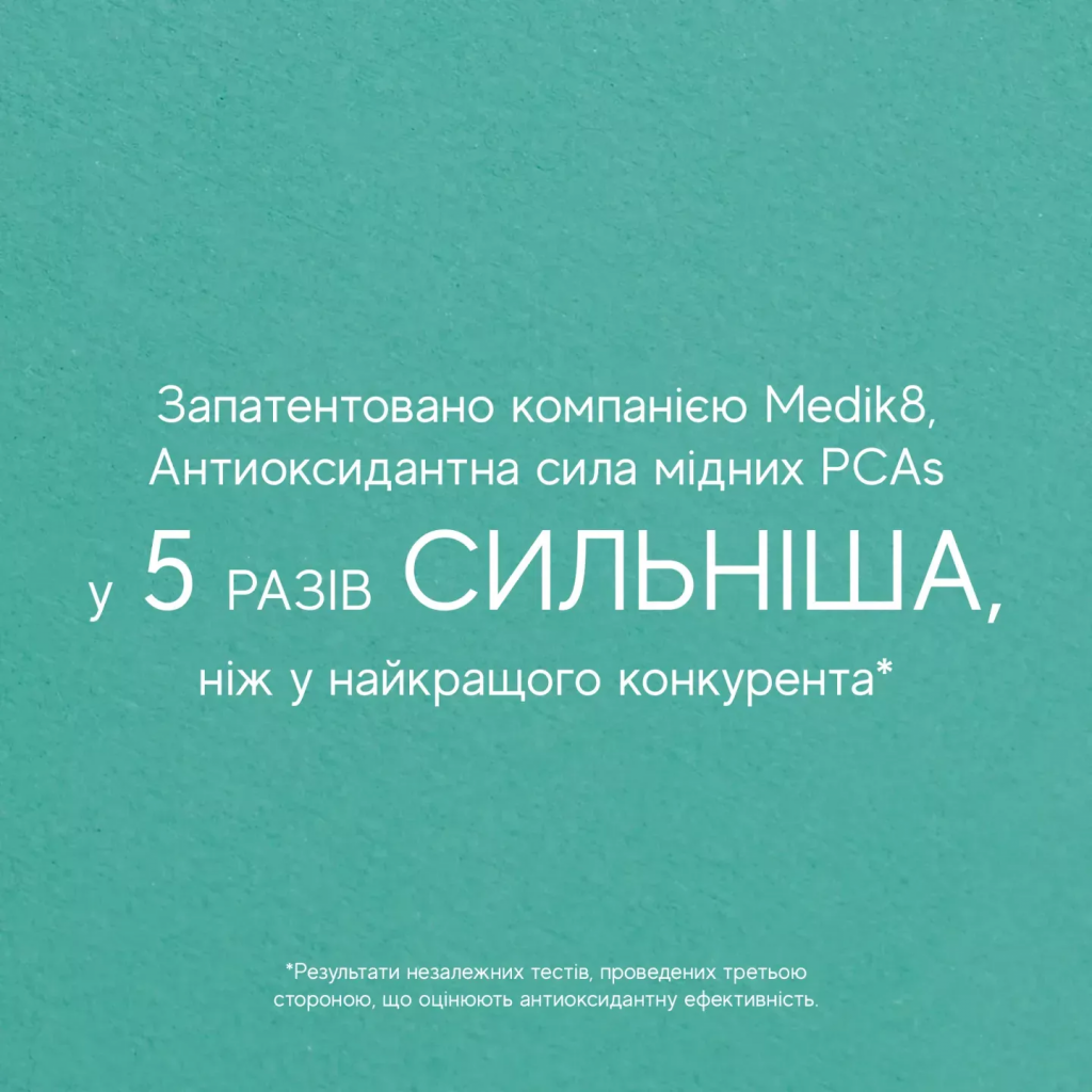 - Мідь PCA — мідна сіль пірролідонкарбонової кислоти, унікальний запатентований інгредієнт, який має в 40 разів вищу антиоксидантну ефективність, ніж вітамін С*. Революційний інгредієнт захищає шкіру від шкідливих вільних радикалів і заспокоює запалення.