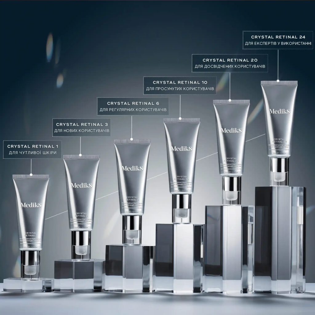 В лінії Crystal Retinal представлено 6 різних концентрацій, які дозволяють за потреби переходити на крок вище й досягати ще помітніших результатів: Crystal Retinal 24, Crystal Retinal 20, Crystal Retinal 10, Crystal Retinal 6, Crystal Retinal 3, Crystal Retinal 1.