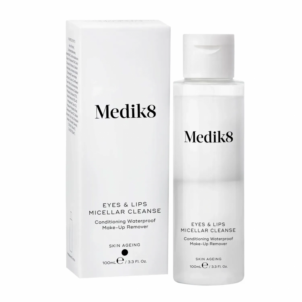 Medik8 Eyes&Lips micellar cleanse — трифазова міцелярна система очищення, яка дбайливо видаляє навіть стійкий макіяж губ і очей, але не сушить і не стягує шкіру. Формула швидко і без зусиль розчиняє водостійку туш і високопігментовану помаду, при цьому кондиціонує й зволожує вії та шкіру, дарує ніжність та м’якість.