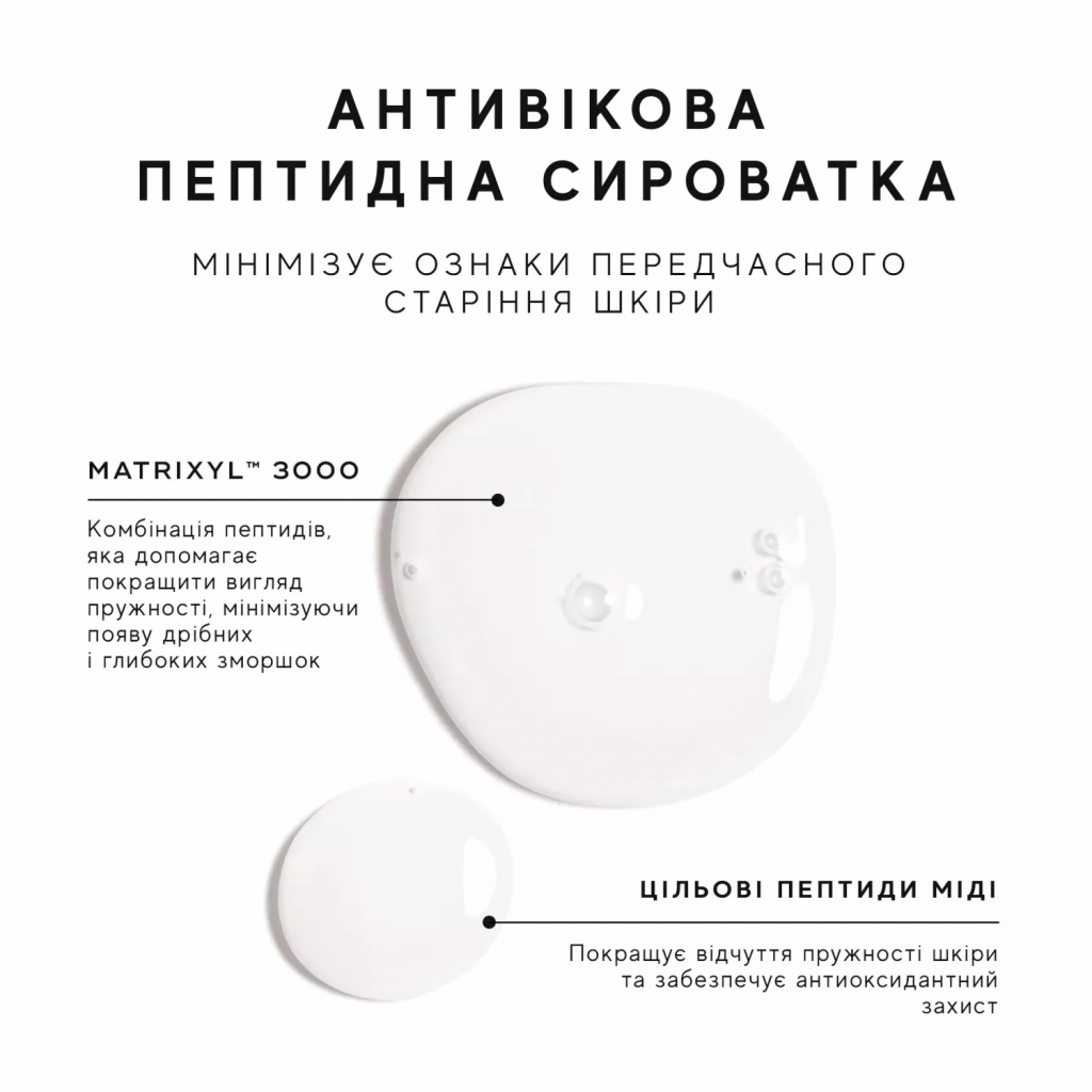 - MATRIXYL™ 3000 —поєднання пептидів, які «обманюють» шкіру і змушують її виробляти більше колагену. Це допомагає зміцнити й ущільнити шкіру, розгладити лінії й зморшки.