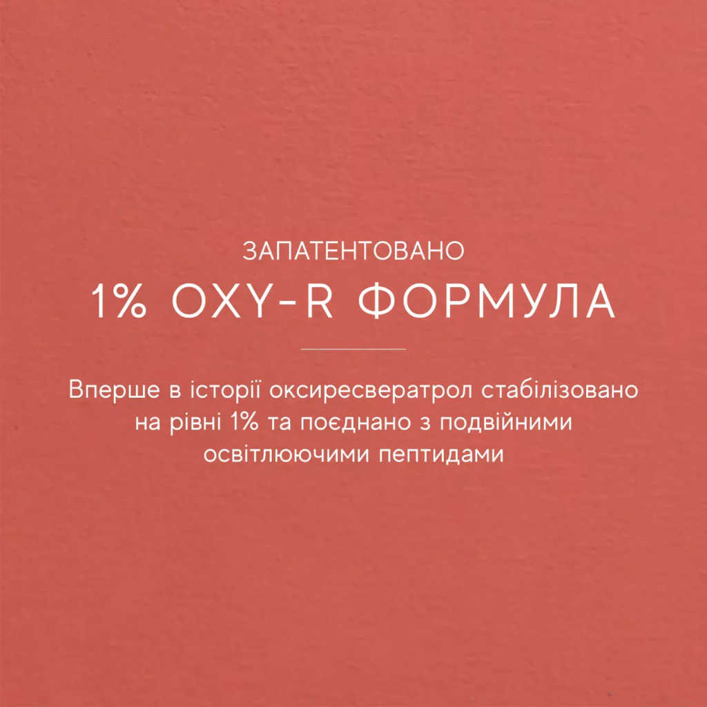 - 1% оксиресвератрол (Oxy-R) — один із найпотужніших освітлювальних інгредієнтів у догляді за шкірою. Природний компонент, присутній в екстракті шовковиці. Блокує дію тирозинази, освітлює й повертає сяйво тьмяній шкірі з нерівним тоном.