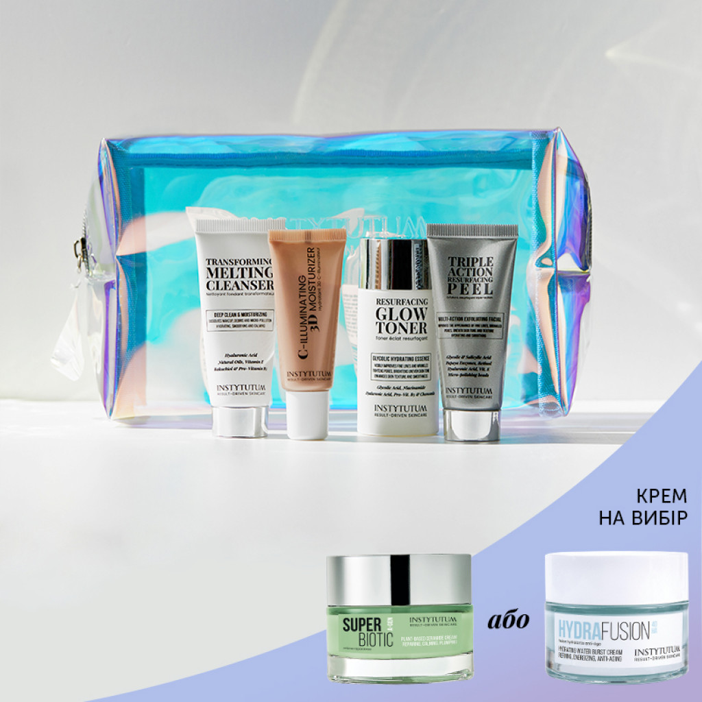 Повноцінний набір, який дозволяє познайомитись з усіма бестселерами бренду Instytutum. До набору входять 4 мініатюри та повнорозмірний крем на вибір. Дані засоби закривають усі базові потреби із догляду: вмивання, ексфоліацію, тонізацію, зволоження та відновлення. Продукти Instytutum підтримують pH шкіри в нормі, зволожують та попереджають передчасне старіння. Завдяки яскравій косметичці набір зручно брати з собою.