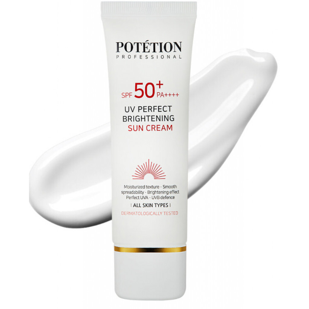 POTETION UV Perfect Brightening Sun Cream SPF 50+ PA++++ - сонцезахисний крем. Захищає від UVA/UVB випромінювання та "синього спектру". На основі рослинних стовбурових клітин, перешкоджає передчасному старінню. Заспокоює і зволожує шкіру. Легка текстура молочка, без ефекту білої маски. Підійде для комбінованої і зневодненої шкіри. Освітлює, перешкоджає появі пігментації.