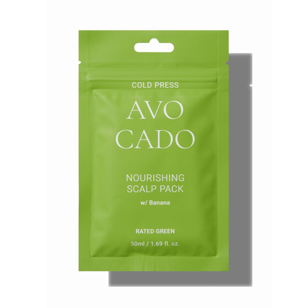 Rated Green Cold Press Avocado Nourishing Scalp Pack - живильна маска з маслом авокадо. Засіб містить органічне масло авокадо холодного віджиму, ретельно підібрані натуральні компоненти та екстракт банану, ефективно укріплює та живить шкіру голови і волосся.