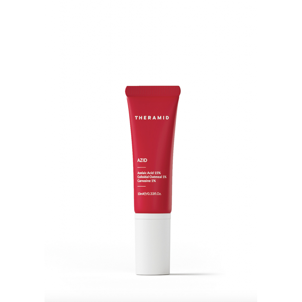 Theramid Azid Azelaic Acid 15% Treatment. Унікальна формула засобу містить 15% азелаїнової кислоти - потужного багатофункціонального активного інгредієнта з антиоксидантними, антибактеріальними, протизапальними та себорегулюючими властивостями. Регулює вироблення шкірного сала, звужує пори та ефективно бореться з гіперпігментацією. Лікує та зменшує плями, заспокоює почервоніння, вирівнює текстуру та тон шкіри. Робить шкіру однорідною, гладкою та сяючою.