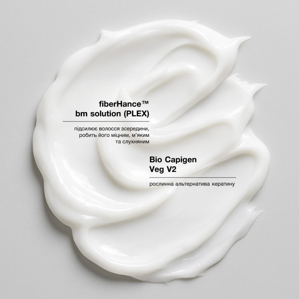 - fiberHance™ bm solution (PLEX) — інноваційний комплекс, що проникає у кортекс і сприяє утворенню нових водневих та іонних зв’язків у структурі кератину. Допомагає відновити міцність, пружність і стійкість волосся після фарбувань і термічного впливу.