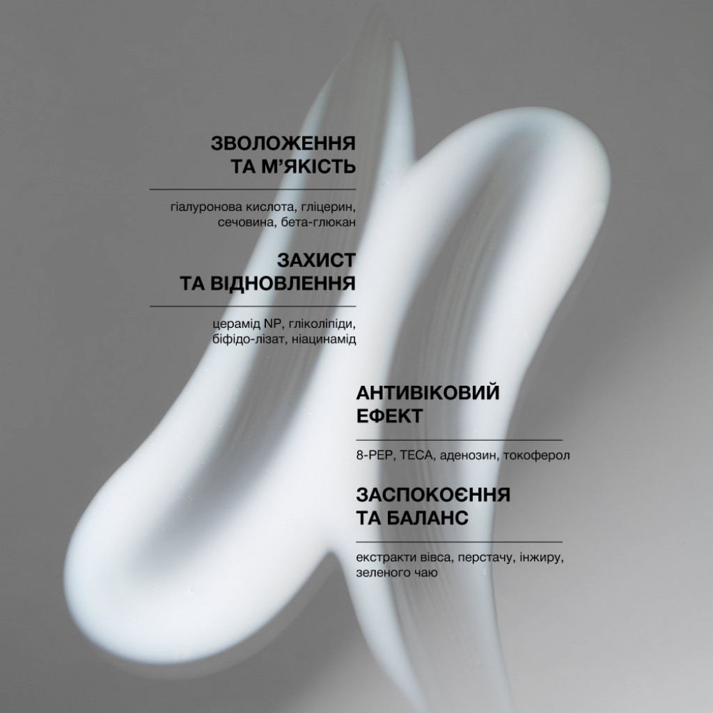 - Екстракт зерен вівса – має заспокійливу та протизапальну дію, глибоко зволожує та допомагає підтримувати природний бар’єр шкіри.