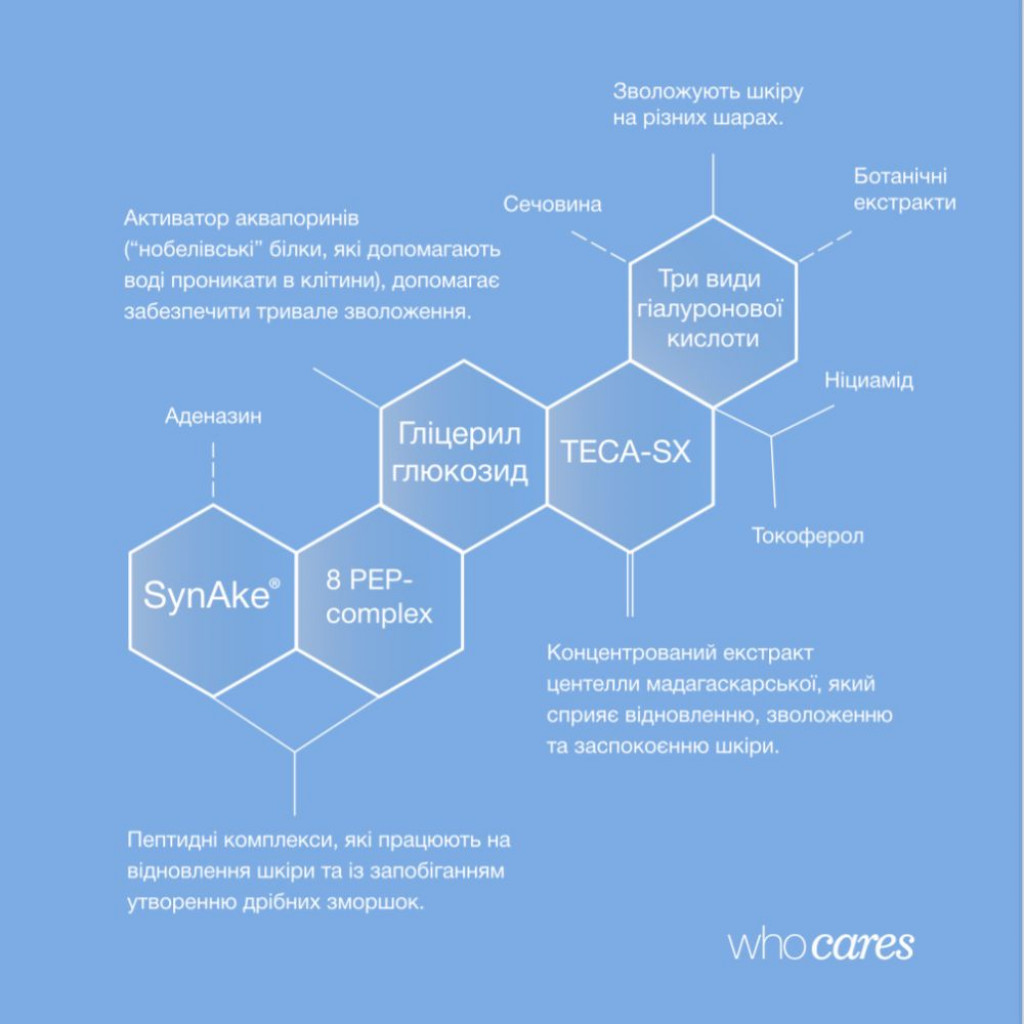 Щоб ефект зволоження був тривалим, у складі є гліцерил глюкозид — активатор аквапоринів (білків, які допомагають воді проникати в клітини). Цей компонент запобігає сухості та підвищує еластичність шкіри.